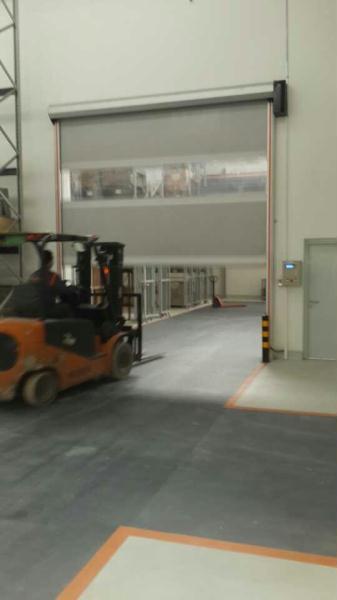 此批鋁合金框架快速門,業主選用的是地磁環感應自動開門配置,車間內當有叉車準備從快速門處通過時,車輛進入地磁感應區域后,迅速觸發開門信號給西朗伺服控制系統,伺服快速門以1.5米/秒的速度快速開啟,車輛順利通過,車輛通過約幾秒后,伺服快速卷簾門自動延時關門,使快速門處于常閉狀態,保證室內的密閉效果和潔凈度。同時伺服快速門還配有安全電眼保護系統,當人或車輛在門下時,門不關,或者門正在關門過程中時,有人或車輛到門下,觸發紅外電眼,門體快速反彈至最開位,保證人員及車輛的安全。
